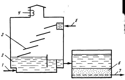 1 — подача озона, 2 — камера озонирования, 3 — ступенчатый каскадный аэратор, 4 — поглотитель остаточного озона, 5 — подача исходной воды, 6 — двуслойный фильтр, 7 — отвод чистой воды