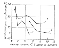 Твердые углеводороды нефтяных фракций, так же как и жидкие, представляют собой сложную смесь парафиновых углеводородов нормального строения разной молекулярной массы; изопарафиновых, различающихся по числу атомов углерода в молекуле, степени разветвленности и положению заместителей; нафтеновых, ароматических и нафтеноароматических с разным числом колец и длинными боковыми цепями как нормального, так и изостроения. Температура плавления твердых углеводородов зависит от структуры их молекул, что видно на примере трех типов углеводородов с одинаковым числом атомов углерода в молекуле (рис. 1), но с разными структурой и положением заместителя. Так, наиболее резко температура плавления углеводородов снижается при перемещении заместителя: от первого атома углерода в цепи н-алкана ко второму. При дальнейшем перемещении заместителя к центру молекулы температура плавления продолжает снижаться, причем насыщенные заместители (см. кривые 2 и 3) оказывают более сильное влияние на снижение температуры плавления углеводорода, чем фенильные радикалы.