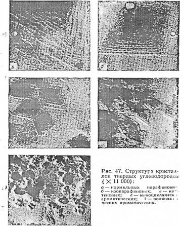 Сущность процесса депарафинизации заключается в отделении твердых углеводородов от жидкой фазы, в связи с чем важную роль играет их кристаллическая структура, т. е. форма и размер кристаллов, которые в значительной мере предопределяют скорость и четкость разделения фаз. Так как твердые углеводороды нефти являются многокомпонентной смесью, большое значение имеет кристаллическая структура не только углеводородов отдельных гомологических рядов, но и их смесей. Структура кристаллов парафиновых, нафтеновых и ароматических углеводородов, близких по температурам плавления, исследована при помощи электронной микроскопии (увеличение в 13 000 раз). Результаты исследования (рис. 2) показали, что углеводороды всех рядов при кристаллизации из неполярных растворителей, в том числе и из нефтяных фракций, образуют кристаллы орторомбической формы, состоящие из параллельных ромбических плоскостей, т. е. каждая новая плоскость (слой) формируется на ранее образованной. Кристаллы твердых углеводородов, принадлежащих к разным гомологическим рядам, различаются по размерам и числу ромбических плоскостей (слоистости). Наиболее крупные и слоистые кристаллы имеют парафиновые углеводороды (см. рис. 2, а, б). Нафтеновые и особенно ароматические углеводороды характеризуются меньшим размером кристаллов и меньшим числом ромбических плоскостей (см. рис. 47, в – д.).