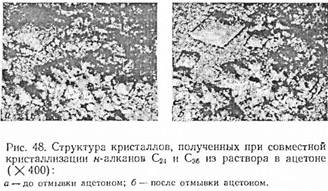 При понижении температуры в первую очередь выделяются кристаллы наиболее высокоплавких углеводородов, на кристаллической решетке которых последовательно кристаллизуются углеводороды с меньшими температурами плавления. На рис 2 г. показаны кристаллы (увеличение в 400 раз), полученные совместной кристаллизации н-алканов С24 и С36, резко различающихся по температуре плавления, из раствора в ацетоне. На рис. 3б дана структура кристаллов н-алкана С36 после отмывки ацетоном. Анализ смытых кристаллов показал, что они принадлежат углеводороду С24, выделившемуся на кристаллах более высокоплавкого углеводорода.