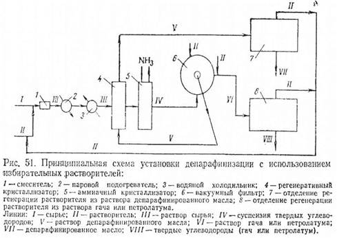 Депарафинируемое сырье I и растворитель II (рис.) в смесителе 1 смешивают в определенном соотношении и подвергают термообработке в паровом подогревателе 2. Если температура сырья, подаваемого на установку, выше 60 °С, то термообработку не проводят. Далее раствор сырья III охлаждается сначала в водяном холодильнике 3, потом в регенеративных кристаллизаторах 4, где хладоагентом служит раствор депарафинированного масла (фильтрат) V, и, наконец, в аммиачных кристаллизаторах 5, в которых хладоагентом является аммиак. Если температура конечного охлаждения раствора сырья ниже - 30 °С, то в качестве хладоагента на последней стадии охлаждения используют этан. Холодная суспензия твердых углеводородов в растворе масла IV поступает через приемник (на схеме не показан) в фильтры 6 (на некоторых установках — в центрифуги) для отделения твердой фазы от жидкой. Осадок твердых углеводородов на фильтре промывается холодным растворителем II и поступает в шнековое устройство, куда также добавляют некоторое количество растворителя II, обеспечивающее возможность перемещения осадка. В результате фильтрования получают раствор депарафинированного масла V, содержащий 75-80% растворителя, и раствор твердых углеводородов (гача или петролатума) VI с относительно небольшим содержанием масла. Оба раствора направляют в секции регенерации растворителя 7 и 8.
