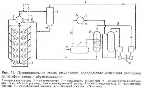 На большинстве установок депарафинизации и обезмасливания в качестве хладоагента применяют аммиак, а в последнее время — пропан, циркулирующий по замкнутой системе холодильной установки. Принципиальная схема холодильного отделения с использованием аммиака приведена на рис. Пары аммиака I, выходящего из кристаллизатора 1 (испарительная система), через аккумулятор 2 поступают в отделитель жидкости 3 (попадание жидкости в цилиндры компрессора может вывести его из строя), а затем - на I ступень сжатия двухступенчатого компрессора 8 и под давлением 0,25—0,3 МПа нагнетаются в промежуточный сосуд 6, в котором они доохлаждаются за счет испарения жидкого аммиака II, подаваемого из рабочего ресивера 5. Из промежуточного сосуда 6 пары аммиака поступают в цилиндр высокого давления соответствующего компрессора, где сжимаются до давления конденсации (1—1,2 МПа). После этого через маслоотделитель 7 пары вводятся в вертикальные кожухотрубчатые водяные конденсаторы-холодильники 4. Сконденсировавшийся аммиак II стекает в рабочий ресивер 5, откуда поступает в змеевик промежуточного сосуда 6, где переохлаждается от 34—36 °С (температура конденсации) до 0—5°С за счет испарения аммиака, содержащегося в сосуде. Переохлажденный аммиак поступает в аккумулятор 2, а затем в кристаллизатор 1, где за счет его испарения происходит охлаждение суспензии твердых углеводородов в растворе масла. Жидкий аммиак подается из промежуточного сосуда 6 в аккумулятор 2 через клапан, связанный с регулятором уровня. Температура охлаждаемой смеси на выходе из кристаллизатора регулируется при помощи клапана на линии отсоса паров аммиака из аккумулятора.