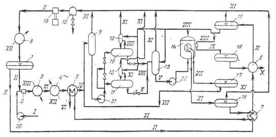 Линии: I -сырье; II -пропан; III-раствор сырья; IV-охлажденный раствор сырья; V-суспензия петролатума; VI-раствор депарафинированного масла на регенерацию растворителя; VII — раствор от промывки осадка на фильтрах; VIII- охлажденный пропан на разбавление лепешки петролатума и на промывку лепешки на фильтрах, на разбавление охлажденного раствора, на добавку к сырьевому раствору для компенсации убыли его при самоохлаждении; IX -суспензия петролатума после фильтра; X- раствор петролатума на регенерацию растворителя; XI- пары пропана на компрессию; XII- вода; XIII-водяной пар.