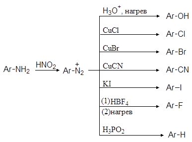 Диазогруппа может быть замещена на разнообразные группы, это является одним из самых лучших путей введения функциональных групп в ароматическое ядро: