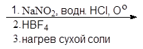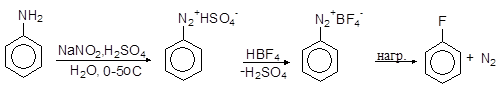 Для замещения диазогруппы на фтор к раствору соли бензолдиазония прибавляют тетрафторборную кислоту, при этом осаждается тетрафторборат бензолдиазония, который отфильтровывают, промывают и сушат. При осторожном нагревании тетрафторборат бензолдиазония разлагается с образованием фторбензола: