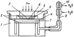 Рис. 1. Дилатометр для исследования фотоинициированной полимеризации: 1 — металлический цилиндр, 2 — оптическое стекло, 3 - прижимная гайка, 4 — резиновая прокладка, 5 — реакционная смесь, 6 - металлическое кольцо, 7 — дилатометрическая жидкость, 8 — полимерная пленка, 9 — капилляр, 10 – холодильник