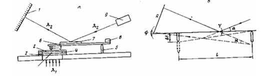 Рис. 2. Принципиальная (а) и геометрическая (б) схемы оптико-дилатометрической установки для исследования полимеризации с визуальной системой регистрации: 1 — шкала измерений, 2 - оптические стекла, 3 — реакционная смесь, 4 — ограничительная прокладка, 5 — игольчатые опоры, 6 — металлическая или стеклянная пластина, 7 — зеркало, 8 - противовес, 9 - генератор ЛГ-75