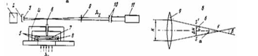 На рис. 2, 3 приведены две оптические установки, применяющиеся для таких исследований. Принцип работы этих установок заключается в следующем: при воздействии монохроматического светового излучения с длиной волны Xt на образец фотополимеризующейся композиции протекает ее полимеризация и толщина композиции уменьшается на величину АН. В связи с этим зеркало 7 установки, изображенной на рис. 2, изменяет свое положение по отношению к горизонтали на угол у (рис. 2, б). При этом отклонение зондирующего монохроматического луча с длиной волны λ2, отражающегося от поверхности зеркала, определяется некоторым углом %, , а расстояние R между двумя световыми точками на регистрирующей шкале для малых углов составляет величину 2L, где L — расстояние от зеркала до шкалы. Угол ч связан с линейным перемещением зеркала соотношением sin ч=АН/1 или для малых углов у=АН/1, где I — расстояние от неподвижной опоры до иглы. Таким образом, координата, фиксирующая отклонение светового луча, определяется выражением