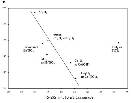 Кроме того, установлена отрицательная корреляция между диэлектрической проницаемостью композитов и суммарным содержанием льюисовских основных и кислотных центров с наиболее низкими и высокими значениями рКа, соответствующими атомам кислорода и металла на поверхности (рисунок 12). Такие центры обладают наименьшей подвижностью под воздействием внешнего поля. По-видимому, введение добавок приводит к разупорядочению элемент-кислородных мостиковых связей в поверхностном слое титаната бария и гидроксилированием поверхности в результате хемосорбции атмосферной влаги.