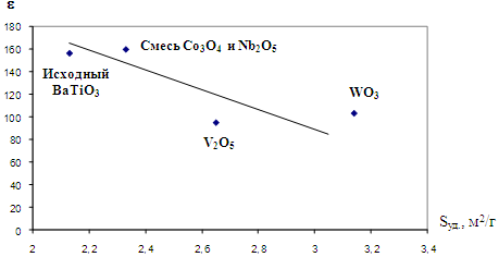 Удельная поверхность закономерно снижается с ростом диэлектрической проницаемости (рисунок 13), который, по-видимому, обусловлен уменьшением размера частиц.