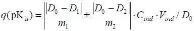 где Cind - концентрация индикатора в растворе, Vind - объем раствора индикатора, взятый для анализа, m1 и m2 – близкие по величине (~20 мг) массы навесок при определении величин D1 и D2 соответственно; знак "+" соответствует разнонаправленному изменению D1 и D2 относительно D0, знак "–" - однонаправленному.