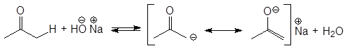 Альдегиды и кетоны могут проявлять, таким образом, свойства С-Н-кислот. Конечно, кислотность карбонильных соединений очень мала, тем не менее именно кислотностью a-атомов водорода объясняются многие их химические свойства. Кислотность a водородов в альдегидах и кетонах объясняется, прежде всего, тем, что при этом анион, образующийся из них при отщеплении протона, стабилизирован резонансом. Отрицательный заряд в нем делокализован.