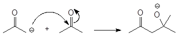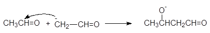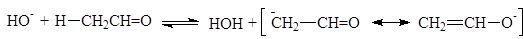 Альдольное присоединение проходит по трехстадийному механизму. На первой стадии основание (гидроксид-анион) отрывает протон от a углерода молекулы ацетальдегида давая енолят-ион с делокализованным отрицательным зарядом: