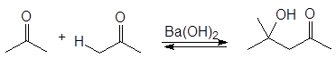 Кетоны также вступают в катализируемое основаниями альдольное присоединение, равновесие не столь благоприятно, как в случае альдегидов. Это препятствие преодолевается проведением реакции в условиях быстрого выведения продукта из реакционной смеси. Из ацетона, например, таким путем может быть получен диацетоновый спирт: