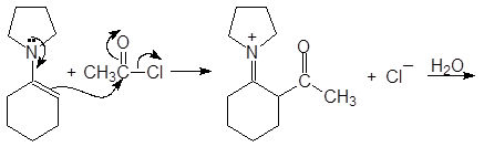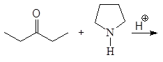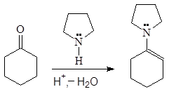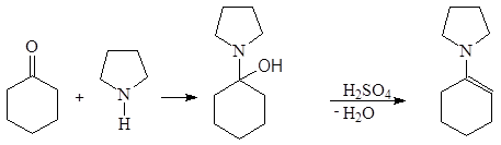 Альдегиды и кетоны, реагируя с вторичными аминами, образуют енамины. Реакция проводится в присутствии следов кислоты и в условиях отделения воды. В качестве вторичных аминов обычно используются циклические амины: