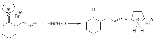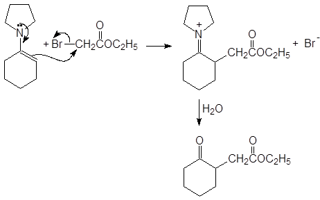 При действии на енамины алкилгалогенидов образуется значительное количество продуктов N-алкилирования, но при нагревании они изомеризуются в продукты С-алкилирования. Особенно легко это происходит с аллил и бензилгалогенидами и с эфирами галогенуксусной кислоты.