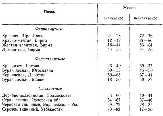 Согласно С. В. Зонну, соединения железа в почвах представлены следующими формами, соотношение которых показано в таблице 1: 1)силикатное железо, входящее в состав кристаллических решеток: а) первичных минералов; б) вторичных (глинистых) минералов; 2) несиликатное (свободное) железо: а) окристаллизованное (слабо или сильно) оксидов и гидроксидов; б) аморфных соединений (железистых и гумус-железистых); в) подвижных соединений (обменных и водно-растворимых).