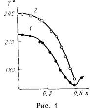 Рис. 1. Зависимость температур фазовых переходов от состава сополиэфиров VIII: 1 и 2 — температуры плавления и изотропизации