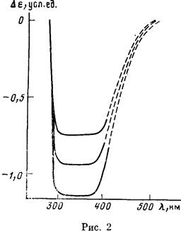 Мы полагаем, однако, что следует с осторожностью связывать наблюдаемый спектр только с круговым дихроизмом, вызванным (закрученной) холестерической структурой пленок, так как сама планарная текстура является двулучепреломляющей и обладает свойствами двуосного кристалла. Об этом свидетельствует изменение кругового дихроизма при повторном снятии спектра одной и той же пленки. В то же время постоянство длины волны максимума спектра КД свидетельствует о том, что основной вклад в явление кругового дихроизма вносит планарная холестерическая текстура.