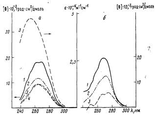 Рис. 3. Спектры поглощения и кругового ди- [в].рад.смг/дМОль хроизма растворов полимеров VII (1), VIII-1, (2), VI1I-10 (3) и VIII-4 (4) в хлороформе (о) и диоксане (б)