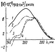 Рис. 4. Спектры кругового дихроизма полимера VIII-10 в различных растворителях: 1 — 100%-ный хлороформ; 2 — 50% хлороформа+ + 50% диоксана; 3 — 22% хлороформа+ 78% диокеана; 4 — 100% диоксана