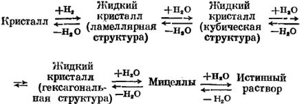 Между кристаллической формой амфифильного вещества и его истинным раствором в воде существует ряд структур. Образующиеся полиморфные мезофазы в зависмости от содержания воды могут иметь ламеллярную (слоистую), кубическую или гексагональную упаковку молекул. При уменьшении содержания воды мезофазы сменяют друг друга в обратном порядке.[3] Схематически эта последовательность превращений выглядит так: