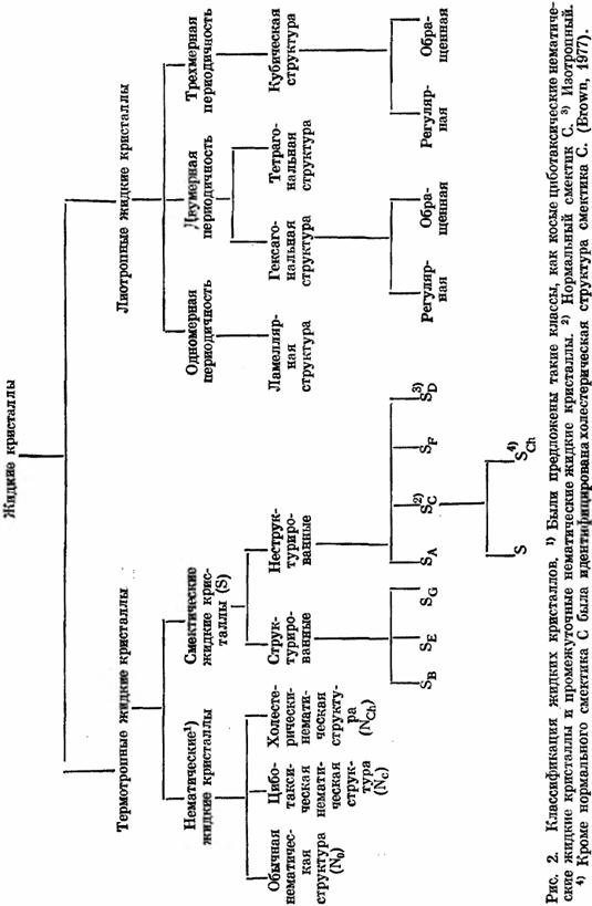 В зависимости от характера расположения молекул согласно классификации, предложенной еще Фриделем, различают три основных типа структур ЖК-соединений: смектический, нематический и холестерический. Указанные типы структур относятся к так называемым термотропным жидким кристаллам, образование которых осуществляется только при термическом воздействии на вещество (нагревание или охлаждение). На рис. 4 показаны схемы расположения стержне- и дискообразных молекул в трех перечисленных структурных модификациях жидких кристаллов.[1]