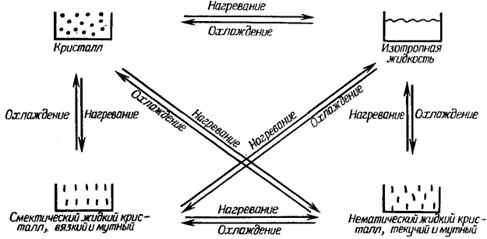 ЖК подразделяют на два типа. Термотропные, как ясно из их названия, образуются при нагревании некоторых твердых веществ. Лиотропные ЖК получают при смешивании двух или более компонентов. ЖК обоего типа свойствен полиморфизм, т.е. данное термотропное соединение или лиотропная смесь может существовать в виде нескольких ЖК структур. Примеры фазовых переходов в термотропных ЖК приведены на рис. 3. Необходимо отметить, что известны и более сложные взаимосвязи между фазами.[2]