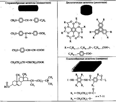Сейчас известно уже около сотни тысяч органических веществ, которые могут находиться в ЖК-состоянии, и число таких соединений непрерывно растет. Если первые десятилетия после открытия жидких кристаллов основными представителями этих соединений являлись только вещества, состоящие из асимметрических молекул стержнеобразной формы, — так называемые каламитики (от греч. "каламис" — тростник), то в последствии было обнаружено, что в ЖК-состояние могут переходить самые разнообразные вещества, имеющие молекулы более сложной формы (диски, пластины и др.). Молекулы ЖК-соединений очень часто называют мезогенами, а группировки или фрагменты молекул, способствующие формированию ЖК-фазы, — мезогенными группами. В таблице 1 приведены примеры стержнеобразных мезогенов — каломитиков, а также химические формулы дискообразных (дискотики) и планкообразных мезогенов (санидики) (от греч. "санидис" — планка).