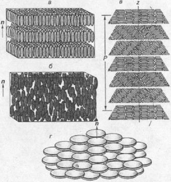 Рис. 4. Основные типы расположения стержне-образных (а-в) и дискообразных (г) молекул в жидких кристаллах: а - смектическая фаза, б - нематическая, в - холестерическая, г - дискотическая (n- директор).