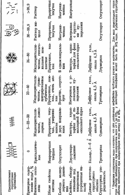 В природе обнаружено несколько геометрических форм расположения амфифильных молекул (табл. 2), кристаллическая упаковка разрушается с образованием ламелярной (слоистой) структуры. При дальнейшем добавлении воды может возникнуть кубическая структура, а затем гексагональная упаковка, далее мицеллярная структура и, наконец, истинный раствор.[2]