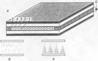 Рис. 12. Электрооптическая ячейка типа "сандвич" с планарной ориентацией молекул (а) и схемы расположения молекул жидких кристаллов в ячейке: б - гомеотропная и в - твист-ориентация. 1 - слой жидкого кристалла. 2 - стеклянные пластинки, 3 - токопроводящий слой, 4 - диэлектрическая прокладка, 5 - поляризатор, 6 - источник электрического напряжения.