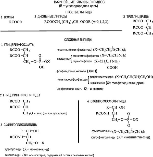 Большинство Л. — производные высших жирных кислот, спиртов или альдегидов. В зависимости от химического состава Л. подразделяют на несколько классов (см. схему). Простые Л. включают вещества, молекулы которых состоят только ив остатков жирных кислот (или альдегидов) и спиртов, к ним относятся жиры (триглицериды и др. нейтральные глицериды), воски (эфиры жирных кислот и жирных спиртов) и диольные Л. (эфиры жирных кислот и этиленгликоля или др. двухатомных спиртов). Сложные Л. включают производные ортофосфорной кислоты (фосфолипиды) и Л., содержащие остатки сахаров (гликолипиды). Молекулы сложных Л. содержат также остатки многоатомных спиртов — глицерина (глицеринфосфатиды) или сфингозина (сфинголипиды). К фосфатидам относятся лецитины, кефалины, полиглицерофосфатиды, фосфатидилинозит, сфингомиелины и др.; к гликолипидам — гликозилдиглицериды, цереброзиды, ганглиозиды (сфинголипиды, содержащие остатки сиаловых кислот). К Л. относят также некоторые вещества, не являющиеся производными жирных кислот, — стерины, убихиноны, некоторые терпены. Химические и физические свойства Л. определяются наличием в их молекулах как полярных группировок ( —COOH, —OH, —NH2 и др.), так и неполярных углеводородных цепей. Благодаря такому строению большинство Л. является поверхностно-активными веществами, умеренно растворимыми в неполярных растворителях (петролейном эфире, бензоле и др.) и очень мало растворимыми в воде.