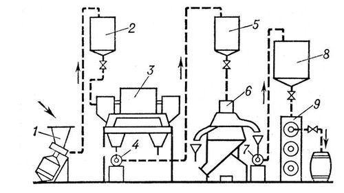 Схема непрерывнопоточной установки АВЖ для производства животных жиров: 1 — центробежная машина АВЖ-245; 2, 5 — питательные бачки; 3 — центрифуга; 4, 7 — центробежные машины АВЖ-130; 6 — сепаратор; 8 — приёмник жира; 9 — шнековый охладитель.