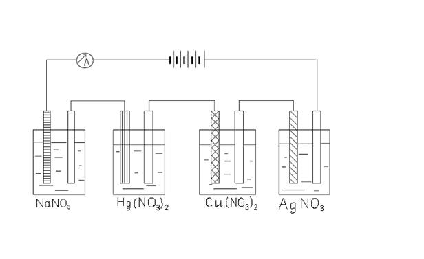Экспериментальное подтверждение законов Фарадея можно получить, если пропустить определенное количество электричества через последовательно соединенные электролизеры, например, с растворами азотнокислых солей натрия, ртути, меди и серебра, поместив в них электроды из платины.