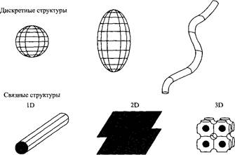 Мицеллы и бислои ПАВ служат "строительными блоками", из которых образуется большинство самоорганизованных структур. Рассмотрим подробнее их различия и приведем некоторые примеры. Как схематично показано на рис. все фазовые структуры ПАВ можно разделить на две группы: а) сформированные ограниченными ансамблями молекул ПАВ, которые можно грубо представить сферическими, вытянутыми, сплюснутыми или цилиндрическими частицами; б) образованные из неограниченных ансамблей молекул ПАВ. В последнем случае агрегаты молекул ПАВ связаны на макроскопических расстояниях в одном, двух или трех направлениях. Гексагональные фазы служат примером одномерной бесконечности, ламелярные фазы - двумерной, а трехмерные бесконечные структуры - это биконтинуальные кубические фазы, губчатые фазы и многие микроэмульсии.