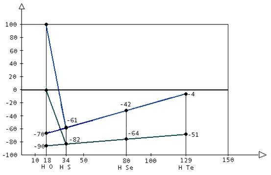 Если соединить нанесённые точки кипения Н2Те, Н2Sе, Н2S, получится почти прямая линия. Казалось бы, точка кипения воды должна лежать на её продолжении. Но она вдруг резко прыгает вверх, к 100°С. Та же странность происходит и при замерзании воды. По графику она должна была бы замерзнуть лишь при –90°С, между тем она превращается в лёд при 0°С.