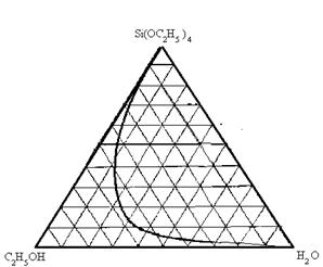 При получении стекла золь-гель методом основным условием распределения компонентов друг в друге на молекулярном уровне является взаимная растворимость всех реагентов, промежуточных соединений и продуктов реакции. При этом следует иметь в виду нерастворимость тетраэтилортосиликата в воде и ограниченную его растворимость в тройной системе ТЭОС – этанол – вода (рис.1.1). Поэтому для успешного протекания процессов гидролиза и поликонденсации необходимо в систему вводить определенное количество этанола, обеспечивающего взаимную растворимость ТЭОСа и воды. Установлено, что оптимальными соотношениями [ТЭОС] / [C2H5OH] при получении монолитных ксерогелей и стекол являются 1:1 и 1:2 [2]. Однако необходимо заметить, что добавление этилового спирта в больших количествах приводит к нежелательным эффектам при сушке гелей, а именно – увеличивает вероятность растрескивания за счет бурного выделения паров спирта из пористой структуры и уменьшает общую концентрацию твердых частиц в теле геля, что приводит к большим усадкам и растрескиванию гелей на стадии перехода гель-стекло.