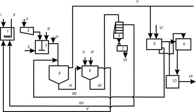 1 – накопитель; 2 – усреднитель; 3 – камера хлопьеобразования; 4 – фильтр-пресс ФПАКМ; 5 – фильтр; 6 – насосная станция; 7 – сушилка СВЛ; 8 – камера получения магнетита; 9 – отстойник; 10 – резервуар очищенной воды; I – ПВ; II – щелочь; III – затравка; IV – флокулянт; V – осветленная вода; VI – вода для подпитки системы; VII – очищенная вода на деминерализационную установку и в производство; VIII – сухой остаток на утилизацию или в отвал; IX – пар; X – воздух; XI – осадок; XII – уплотненный магнетитовый остаток; XIII – вода от промывки фильтра; XIV – фильтрат