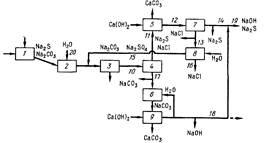 Из содового сепаратора смесь, содержащая большое количество сульфида, по линии // подается в аппарат для подщелачивания 5, в котором происходит удаление остатков карбоната, хотя эта стадия и не является обязательно необходимой. Обычно в аппарате 5 сульфидный раствор обрабатывают известью; при добавлении больших количеств извести достигается полное протекание реакции.
