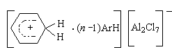В твердом виде хлорид алюминия практически нерастворим в бензоле и является слабым катализатором. Однако в присутствии хлороводорода хлорид алюминия начинает превращаться в темное жидкое вещество, так называемый комплекс Густавсона, обладающий высокой каталитической активностью, и реакция алкилирования постепенно ускоряется. Комплекс Густавсона можно приготовить, пропуская HCl при нагревании через суспензию АlСl3 в ароматическом углеводороде. Комплекс представляет собой соединение АlСl3 и HCl с 1–6 молекулами ароматического углеводорода, одна из которых находится в особом структурном состоянии положительно заряженного иона (σ-комплекс), а остальные образуют сольватную оболочку: