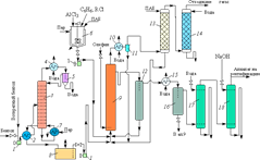 На рис. 1 изображена технологическая схема производства этил- или изопропилбензола алкилированием бензола газообразным олефином в присутствии AlCl3.