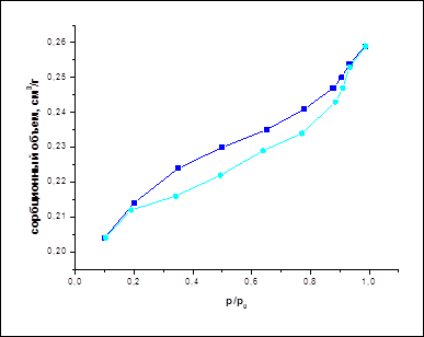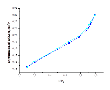 2. Изотерма адсорбции активированного угля, пропитанного магнитной жидкостью гистерезиса практически не имеет. Это говорит о том, что ее можно отнести ко II-му типу. Здесь происходит физическая сорбция.
