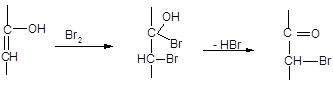 Химический метод определения состава кето-енольной смеси был разработан Мейером. Он основан на том, что енольная форма практически моментально реагирует с бромом. Определение производят следующим образом. К спиртовому раствору ацетоуксусного эфира при – 70 С прибавляют избыток брома; поскольку нарушенное при бромировании равновесие постепенно вновь восстанавливается за счет перехода кето-формы в енол, избыток брома уничтожают путем добавления α-нафтола. Так как образовавшееся бромкетосоединение, содержание которого соответствует содержанию енола в аллелотропной смеси, количественно реагирует с HI с выделением свободного йода, к исследуемому раствору добавляют KI и серную кислоту; выделившийся йод оттитровывают. Весь процесс можно представить следующей схемой: