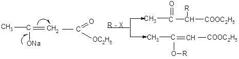 Анионы сложных эфиров типа ацетоуксусного могут быть проалкилированы алкилгалогенидами. Сложный эфир превращается при действии сильного основания в енолят-анион, и последний далее алкилируется по SN2 реакции алкилгалогенидом. Обычно преобладает С – алкилирование.