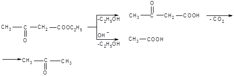 В колбу наливают ацетоуксусный эфир и серную кислоту. Реакционную смесь нагревают до кипения. При этом происходит разложение эфира с образованием ацетона и углекислого газа; последний с баритовой водой образует осадок углекислого газа.