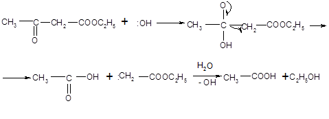 Механизм кислотного расщепления состоит в нуклеофильной атаке гидроксил-ионом карбонильного углерода, несущего частичный положительный заряд. После присоединения гидроксида неустойчивый продукт распадается: