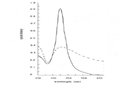 После синтеза гидрозоли серебра исследовались электронно-микроскопическим методом, а также визуально отмечалось изменение окраски растворов и/или образования осадка. Спектры поглощения Ag-гидрозоля регистрировали при комнатной температуре в области 300-700 нм на спектрофотометре Analiticjena (кювета (Q) – 1см).