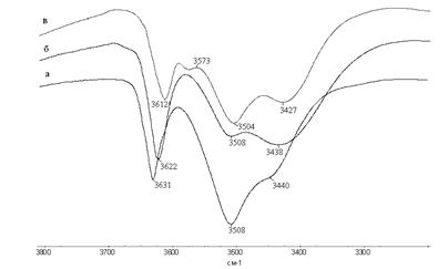 Из рисунка видно, что при растворении БФ в четыреххлористом углероде(а) присутствуют ОН-группы в свободном состоянии(3631 см-1), также видно, что преобладает цис-форма БФ(3508 см-1), то есть образуется внутримолекулярная водородная связь, но есть и небольшая доля транс-БФ(3440 см-1), то есть образуется межмолекулярная водородная связь. Из фрагмента спектра хлороформа (б) видно, что БФ со свободными ОН-группами уже меньше(3622 см-1), а соотношение цис- и транс-БФ примерно 1:1, то есть в хлороформе в равной степени идет образование как внутримолекулярной, так и межмолекулярной водородной связи(3508 см-1 и 3438 см-1 соответственно). В растворе бензола (в) свободные ОН-группы практически отсутствуют, появляется небольшой пик с частотой 3573 см-1 , это говорит о взаимодействии БФ с π-системой бензола и здесь вновь преобладает цис-БФ(внутримолекулярная водородная связь) и в меньшем количестве транс-БФ(межмолекулярная водородная связь). Из таблицы 2 также видно, что при растворении БФ в толуоле и кумоле также преимущественно образуется цис-БФ, в меньшей степени транс-БФ, практически отсутствуют свободные ОН-группы.