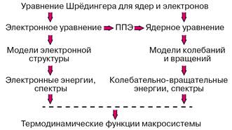 После аппроксимации фрагментов потенциальных поверхностей в окрестностях точек минимумов можно переходить к рассмотрению движений систем ядер молекулы и прогнозировать или интерпретировать колебательно-вращательные спектры. Зная набор электронных колебательно-вращательных энергий молекулы можно с помощью формул статистической термодинамики вычислять любые термодинамические функции данного вещества. Если рассматривается молекулярная система, в которой возможно перераспределение частиц, то есть химическая реакция, то рассчитывается сечение потенциальной поверхности вдоль пути наименьшей энергии, связывающего реагенты и продукты, и затем оценивается константа скорости элементарной химической реакции. Описанная программа действий реализует схему расчетов свойств веществ без привлечения каких-либо эмпирических данных, которая представлена на рисунке 1.